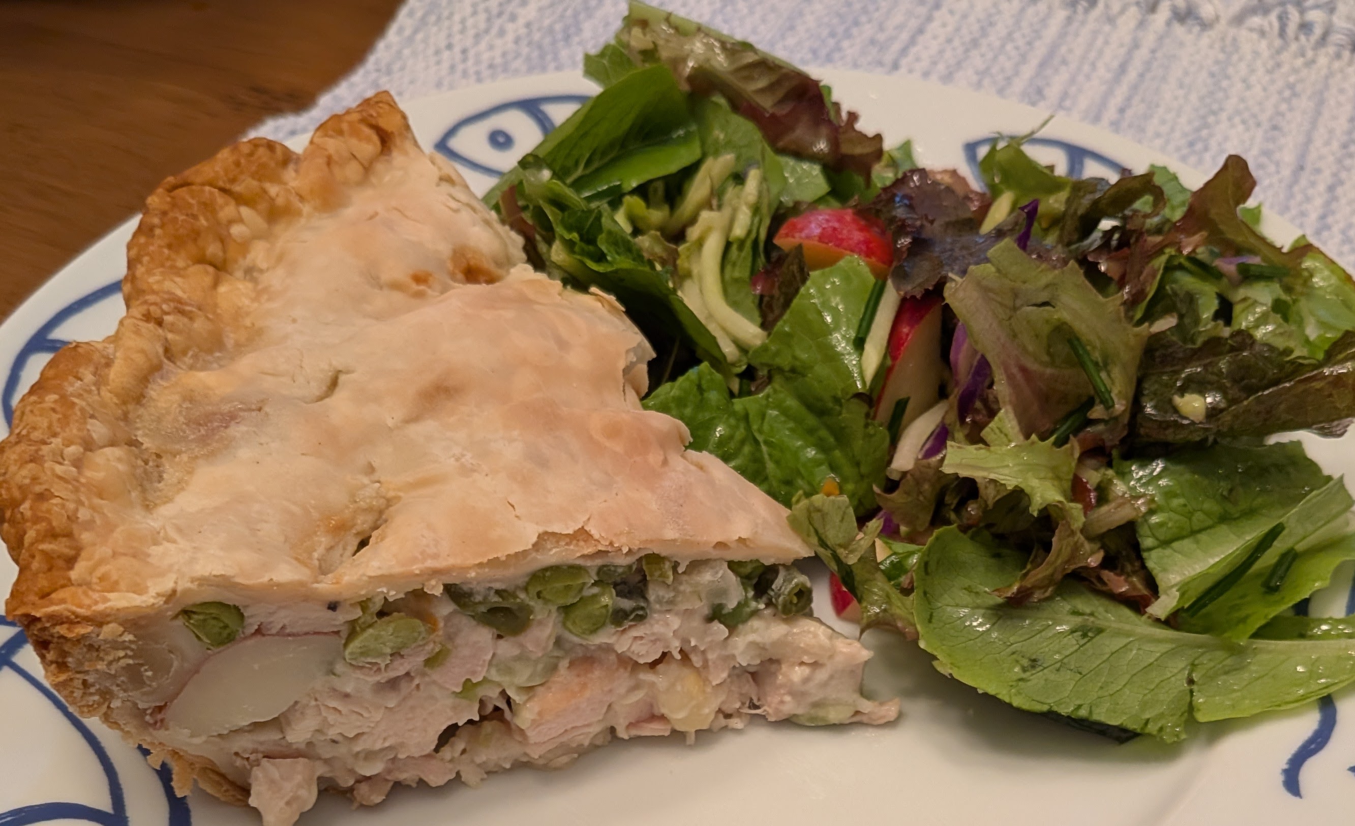 Add the cubed chicken, vegetables, salt, pepper, half and half and combine thoroughly.